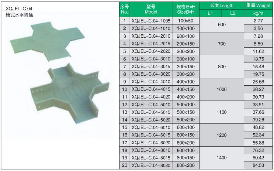 XQJEL_C.04槽式水平四通產品型號、規格、重量等參數及XQJEL_C槽式電纜橋架在不同跨距下允許均布載荷變形量。