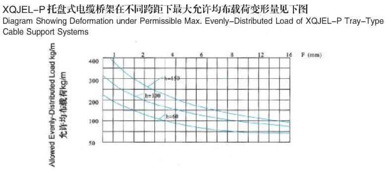 XQJEL_P.06托盤(pán)式垂直下彎通產(chǎn)品型號(hào)、規(guī)格、重量等參數(shù)及XQJEL_P托盤(pán)式電纜橋架在不同跨距下允許均布載荷變形量。